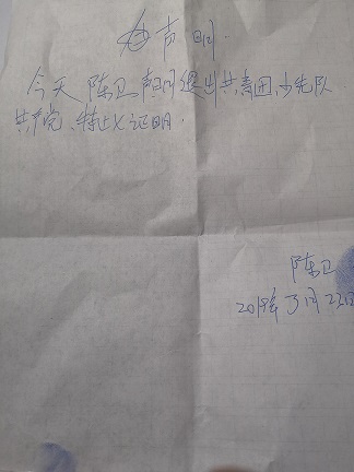 今天陈卫声明退出共产党、共青团、少先队,特此证明。